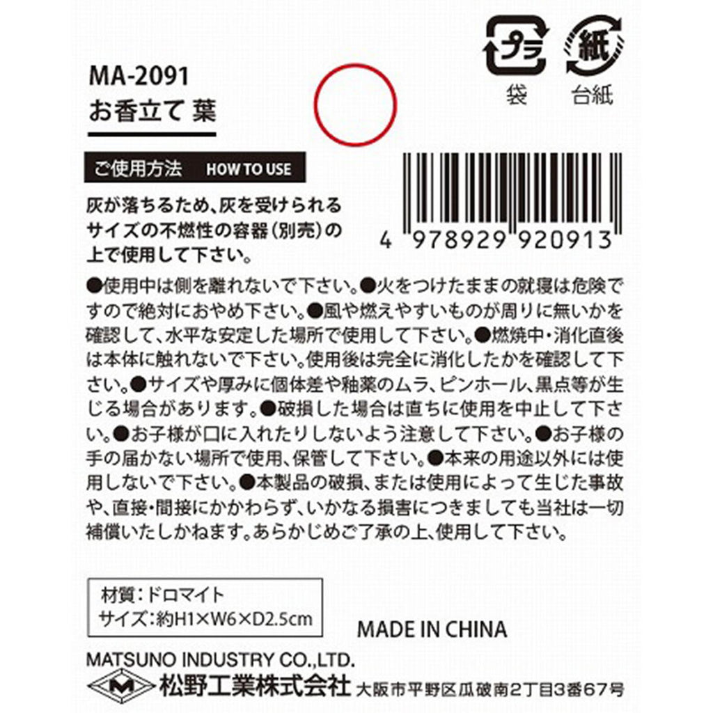 葉っぱデザインの可愛らしいお香立てです 灰が落ちるため、灰を受けられるサイズの不燃性の容器(別売)の上で使用して下さい。