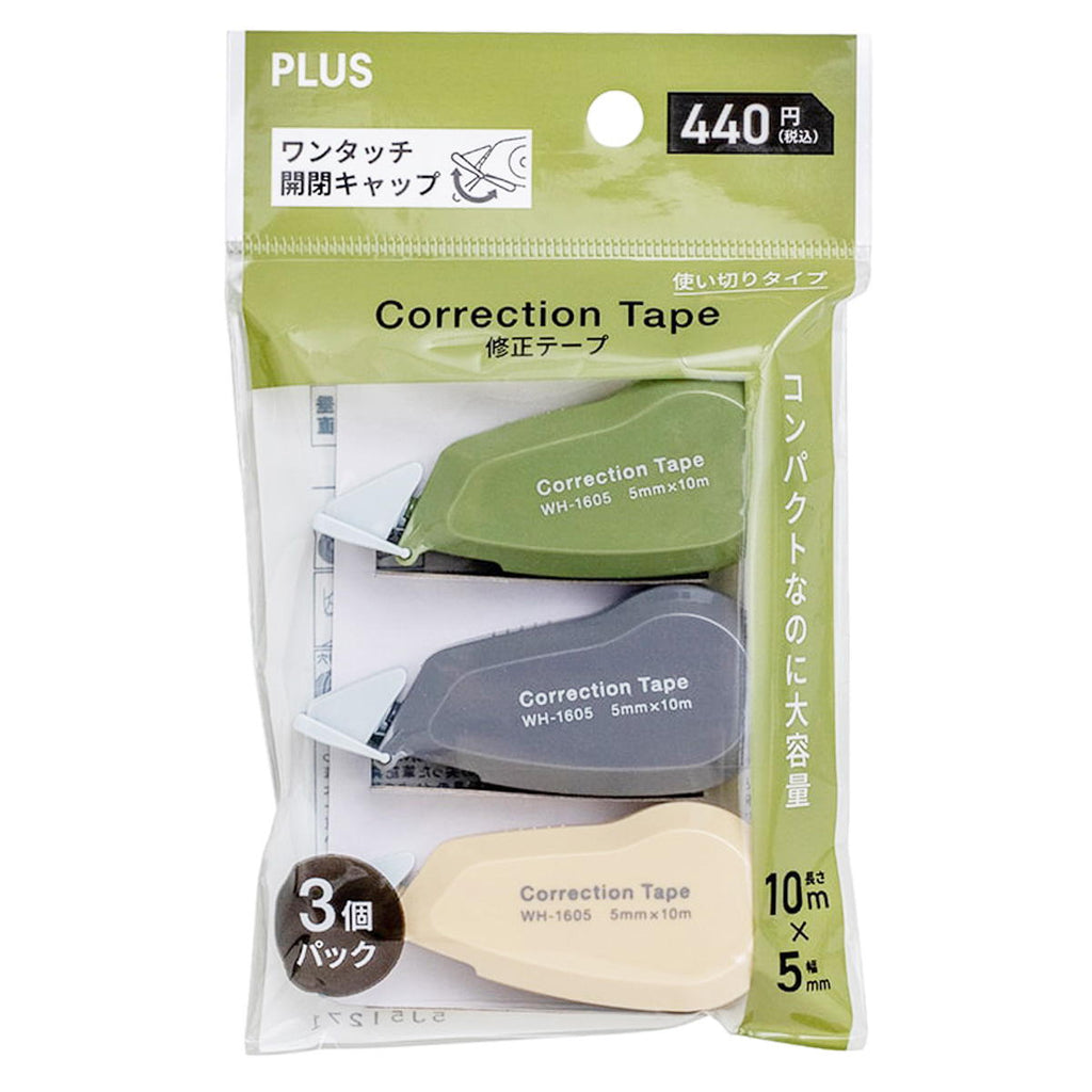 コンパクトながら大容量10m巻きの修正テープ3個セットです。テープ幅は5mmで、約W30×D70×H18mmのサイズに収まります。なくす心配のないワンタッチ開閉キャップ付きです。