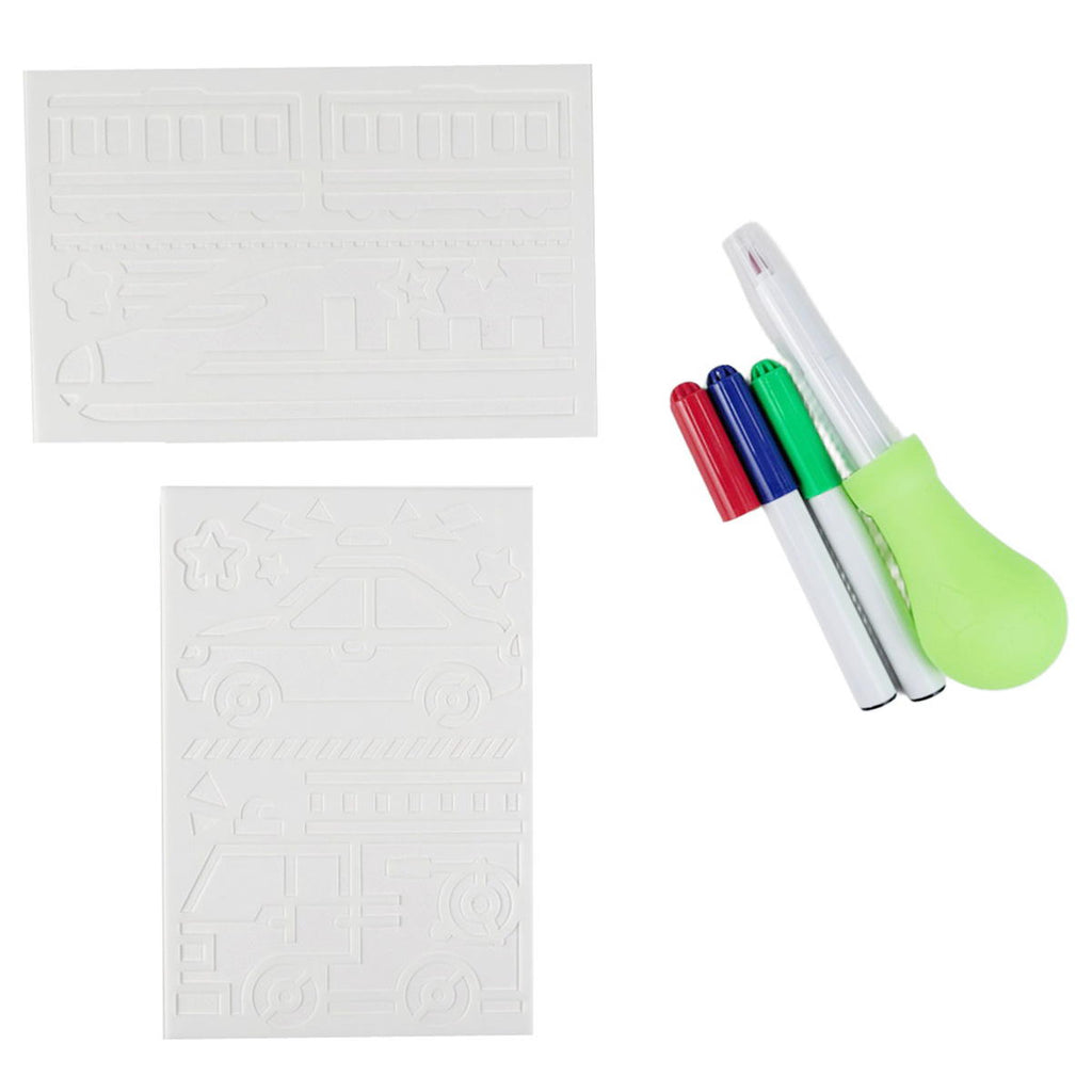 複数の色ペンを組み合わせて、オリジナルの作品が制作できます。のりもの好きな子どもへのプレゼントに向いていて、親子で一緒に楽しめるお絵かきキット。繰り返し使えるステンシルシートなので、何度でも新しい作品が作成できます。