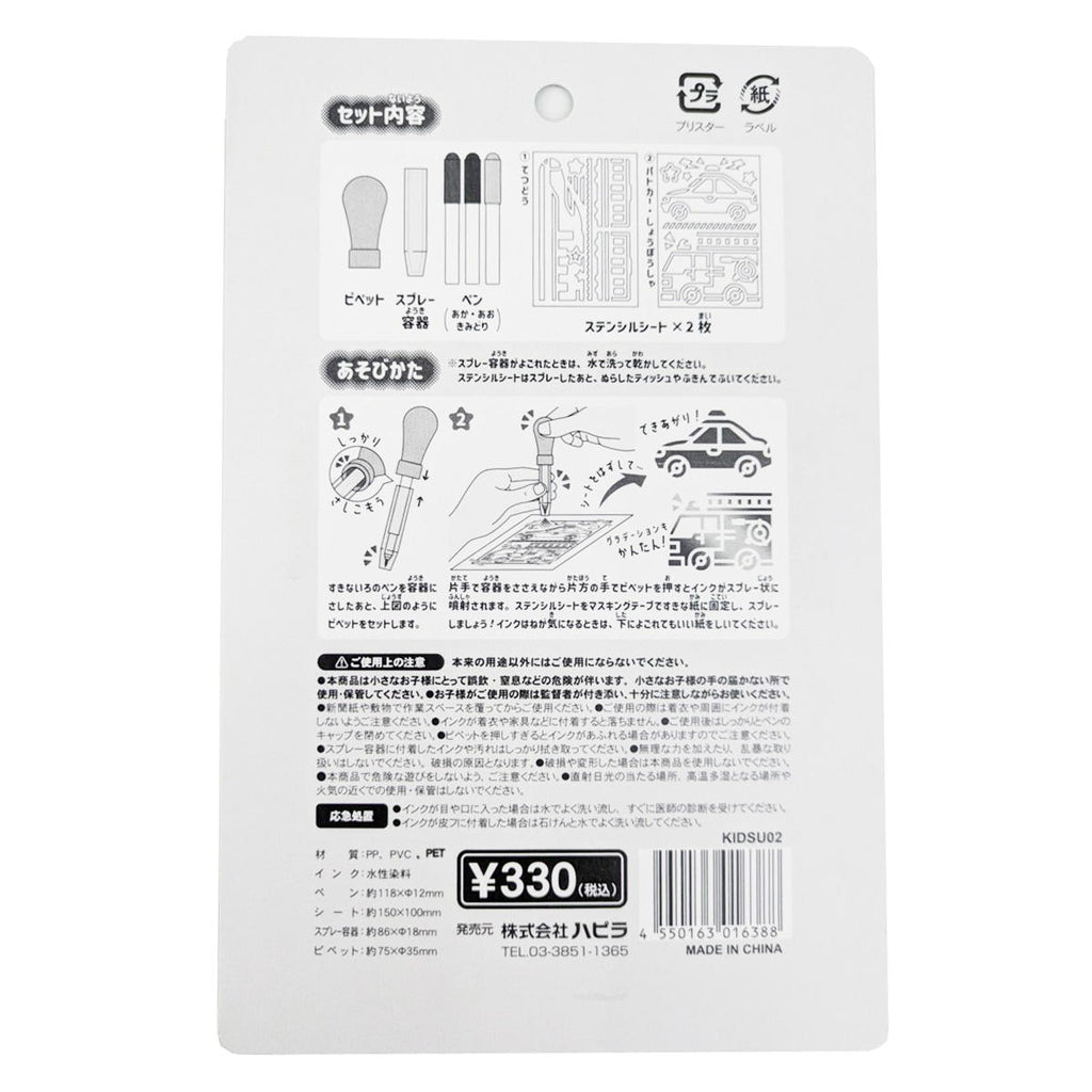 車や飛行機など、のりもの好きな子どもが喜ぶ可愛らしい図案。シートの上に紙を置いてスプレーペンで描くだけで、簡単にきれいな模様が完成します。スプレー容器は約86×18mm、ピペットは約75×35mmのコンパクト設計です。