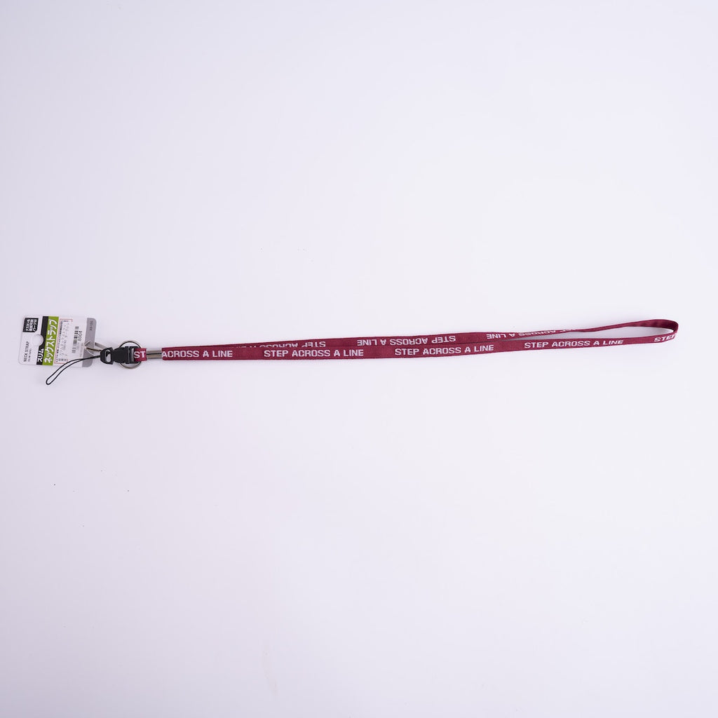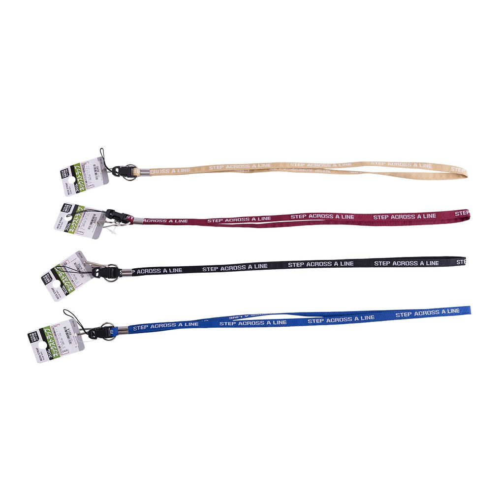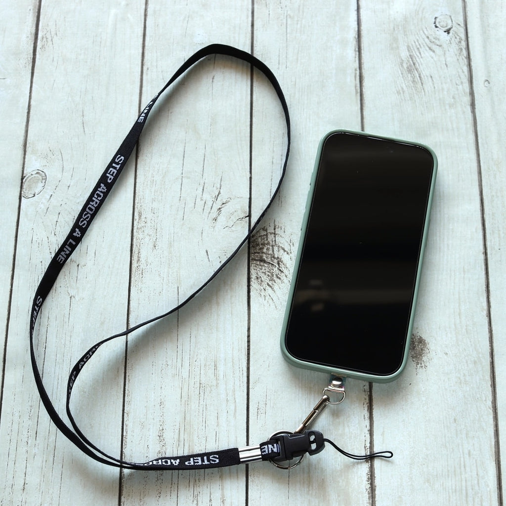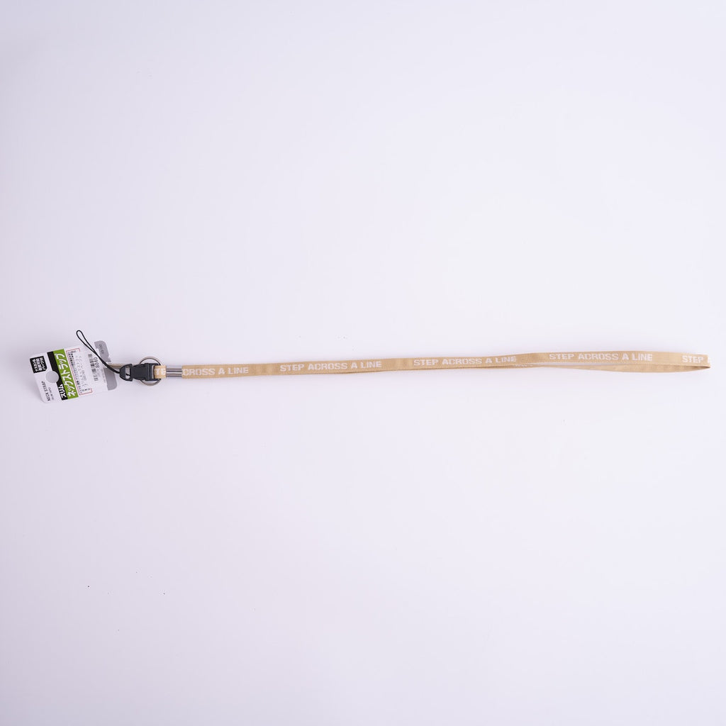 ブラック・ブルー・ダークレッド・ベージュの4色展開。ファッションや利用シーンに合わせて選べます。ストラップには「STEP ACROSS A LINE」の英字がプリントされており、シンプルながらも個性を演出できます。