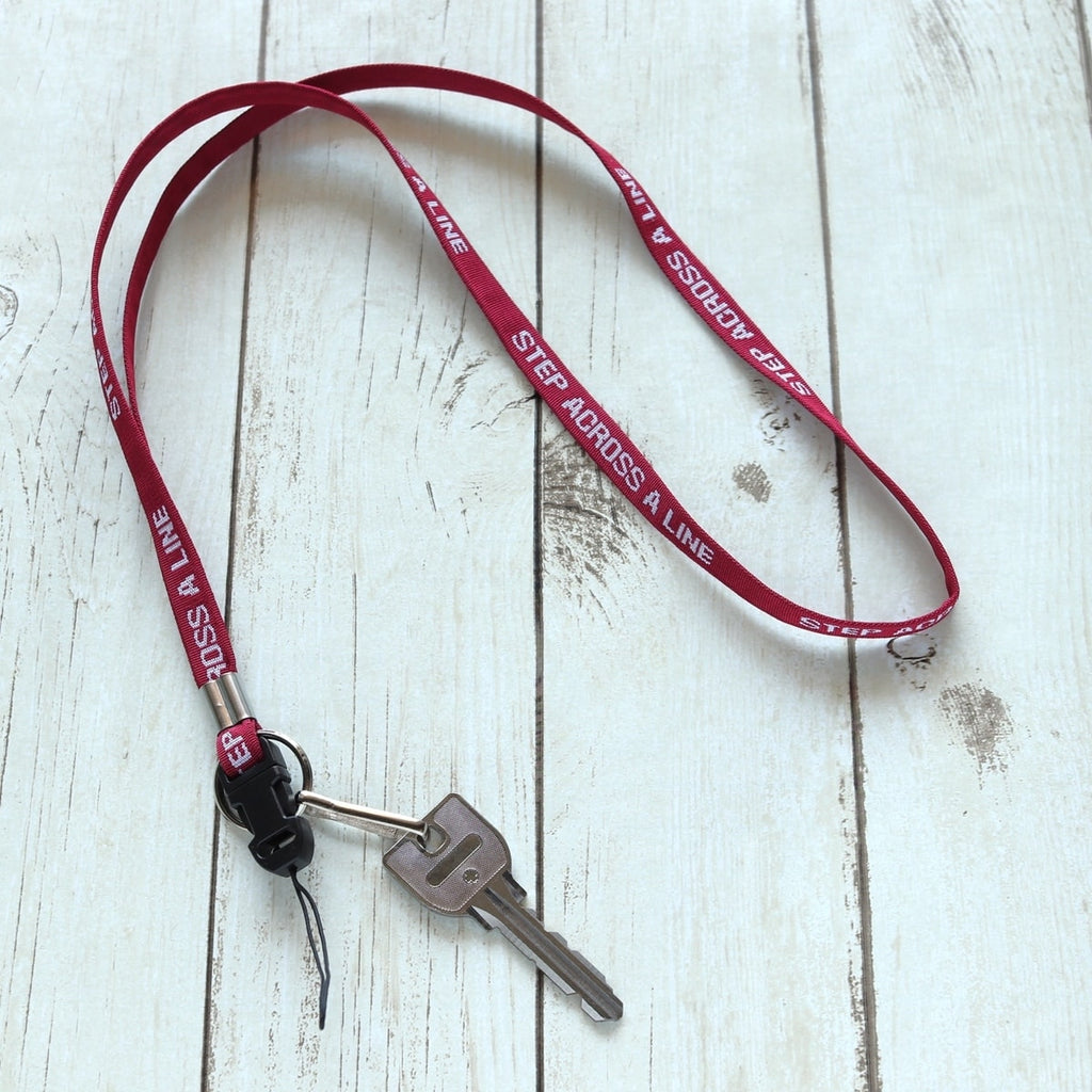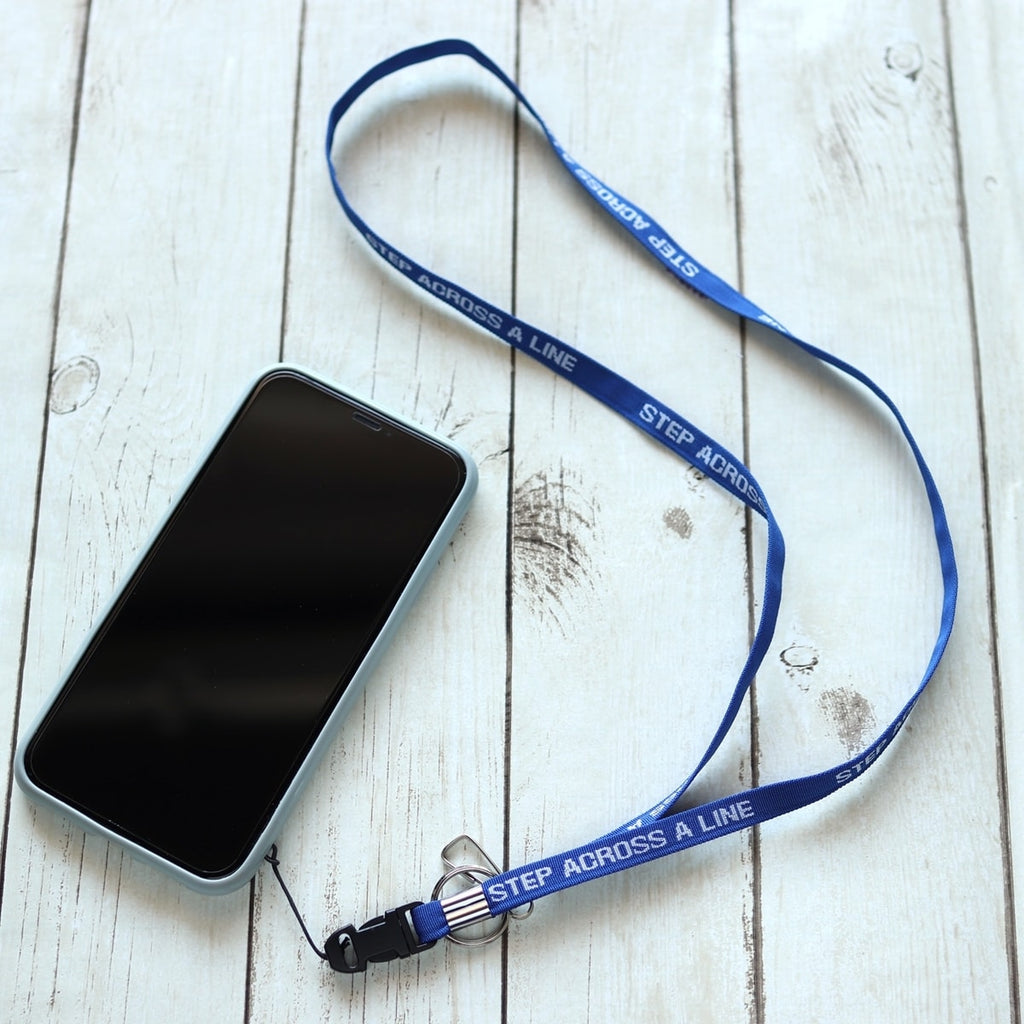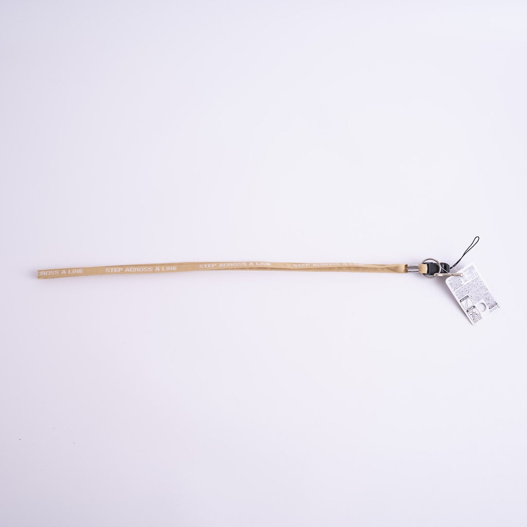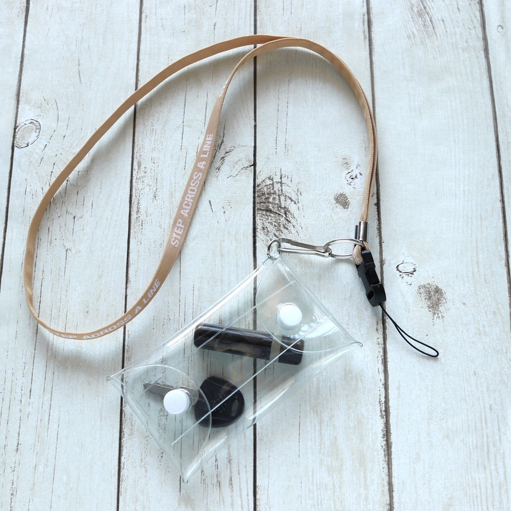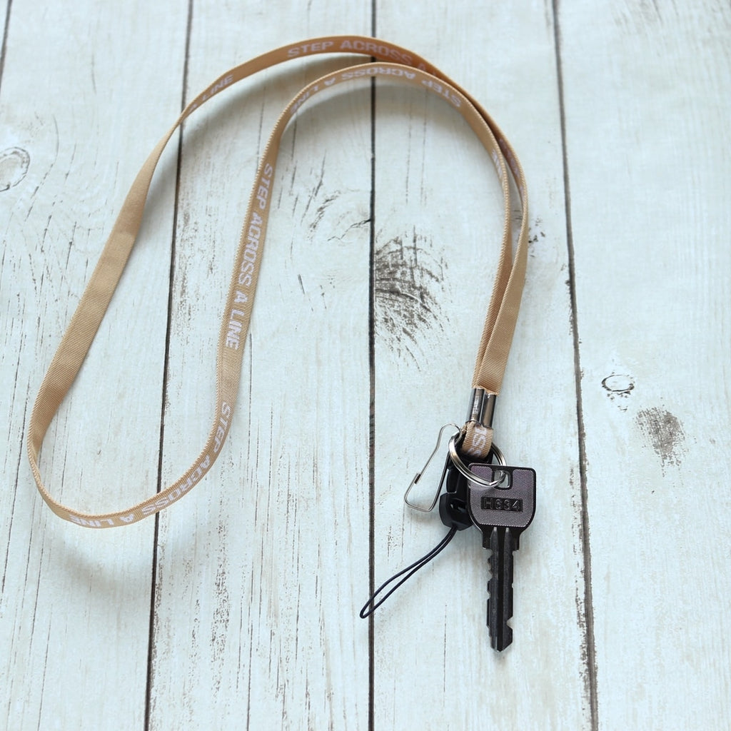 ブラック・ブルー・ダークレッド・ベージュの4色展開。ファッションや利用シーンに合わせて選べます。ストラップには「STEP ACROSS A LINE」の英字がプリントされており、シンプルながらも個性を演出できます。