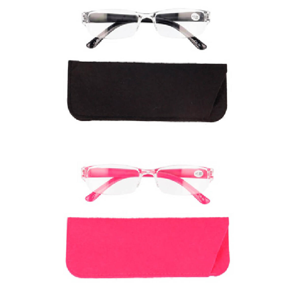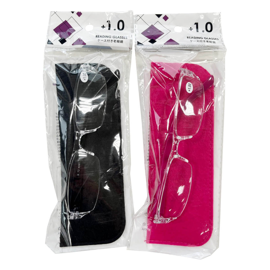 テンプルカラーと同じ色のケースが付いたプラ老眼鏡です。