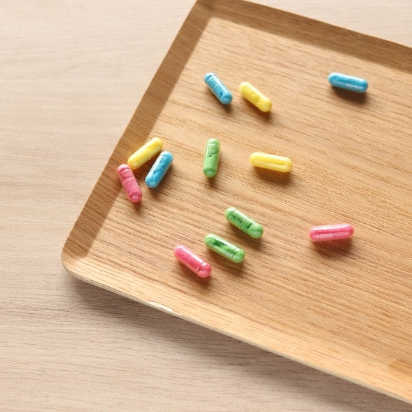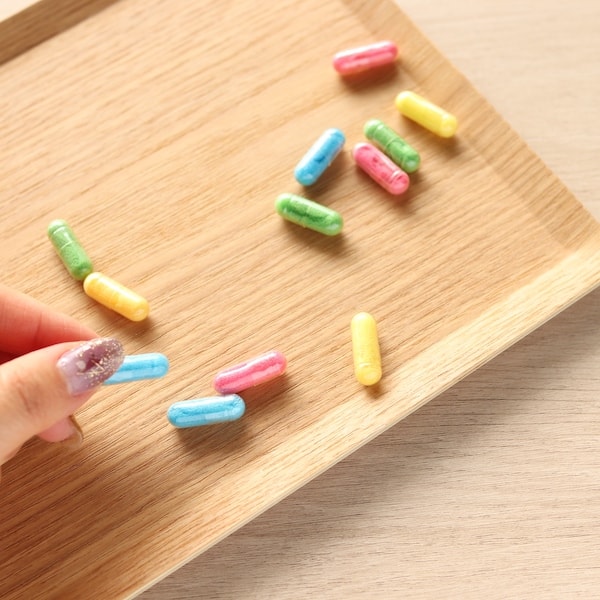 こちらのアイテムは、水につけるとカプセルが溶けて、中のスポンジが膨らむ、スポンジカプセルです。膨らむスポンジのカラーは4種類で12種類のスポンジが膨らみます。