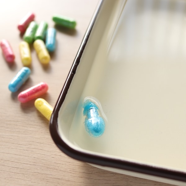 対象年齢は3歳以上で、誤飲防止のため保護者と一緒に遊ぶことを推奨。素材はスポンジがポリウレタンフォーム、カプセル部分はゼラチン製で、溶けやすく処理もしやすい安心設計です。小さなお子さまでも安心して遊べるよう、使い方や注意事項がパッケージにも丁寧に記載されています。