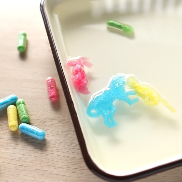 お湯に入れるだけで、カプセルが楽しい形に大変身!