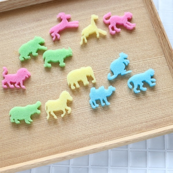 テーマは4種類(動物園・恐竜・水族館など)あり、それぞれ12種類の異なる形のスポンジが展開されています。ピンク・イエロー・グリーン・ブルーの色柄ごとに内容が変わるので、コレクション要素もバッチリ。テーマごとに揃えて、ストーリーを作ったりごっこ遊びをしたりと、想像力を刺激する遊び方が楽しめます。