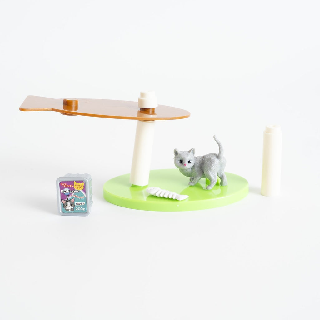 セットに含まれる猫フィギュアは、グレーまたは白の2色展開で、どちらも愛らしい表情とポーズが印象的です。猫用フードやおもちゃなどの小物も細かく作られており、まるで本当に猫が暮らしているようなリアルな空間が演出できます。見る人の心を和ませる、丁寧に作り込まれた世界観が魅力です。